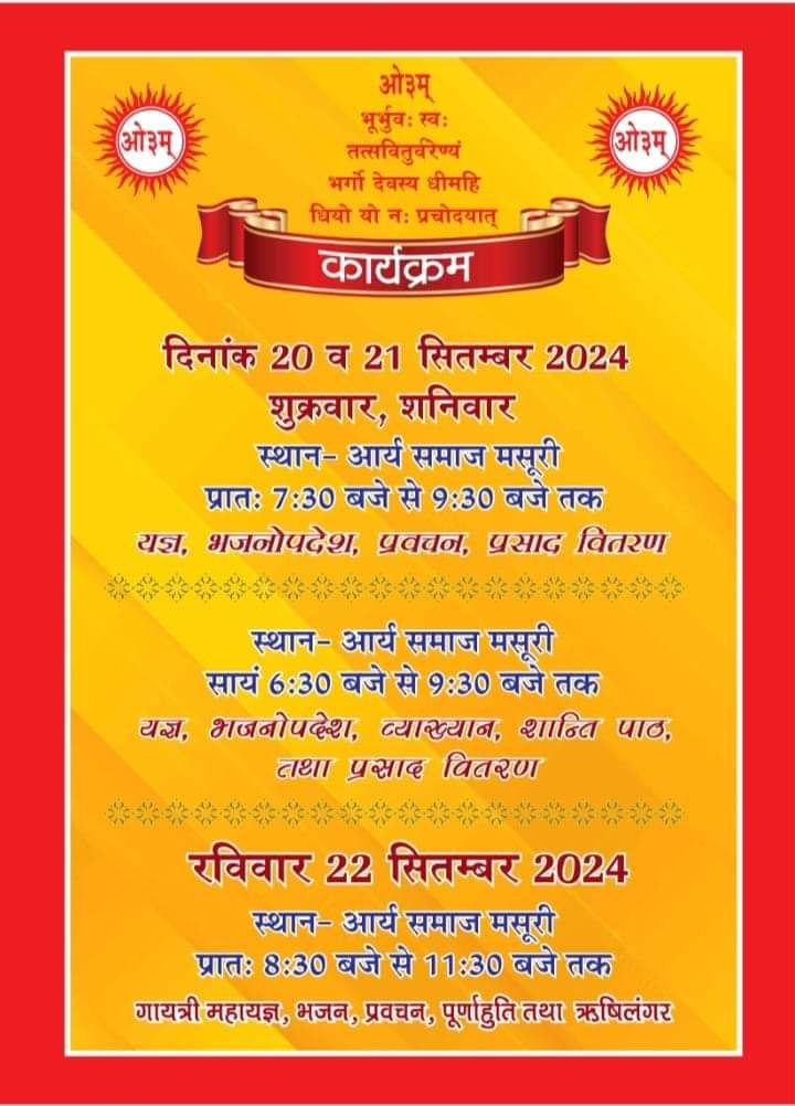 महर्षि दयानन्द सरस्वती जी आर्य समाज मसूरी वार्षिकोत्सव के उपलक्ष्य में सस्नेह निमंत्रण