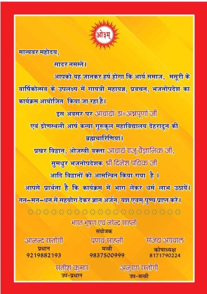 आर्य समाज मसूरी वार्षिकोत्सव के उपलक्ष्य में सस्नेह निमंत्रण