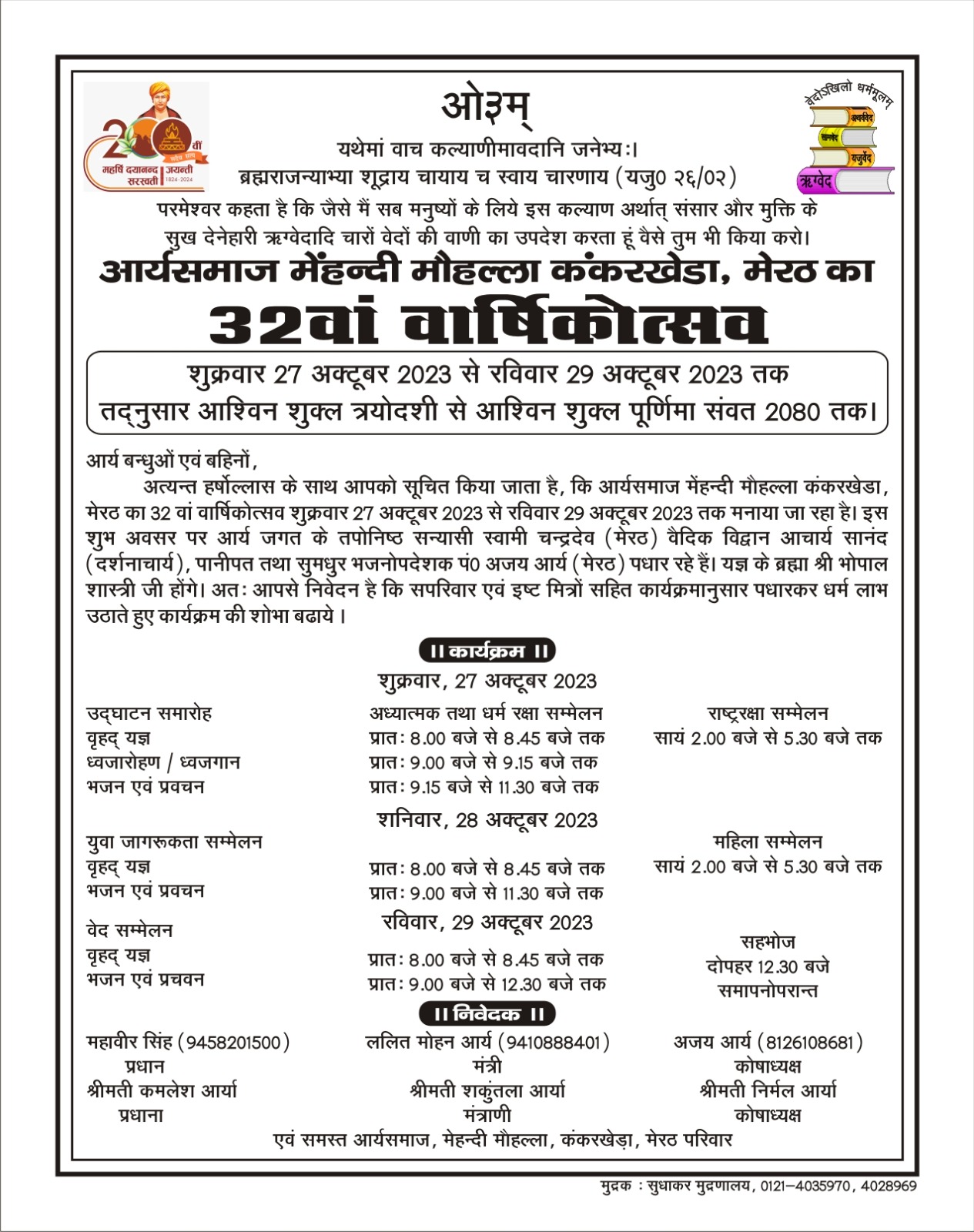 अत्यन्त हर्षोल्लास के साथ आपको सूचित किया जाता है, कि आर्यसमाज मेंहन्दी मौहल्ला कंकरखेडा, मेरठ का 32 वां वार्षिकोत्सव शुक्रवार 27 अक्टूबर 2023 से रविवार 29 अक्टूबर 2023 तक मनाया जा रहा है। इस शुभ अवसर पर आर्य जगत के तपोनिष्ठ सन्यासी स्वामी चन्द्रदेव (मेरठ) वैदिक विद्वान आचार्य सानंद ( दर्शनाचार्य), पानीपत तथा सुमधुर भजनोपदेशक पं० अजय आर्य (मेरठ) पधार रहे हैं। यज्ञ के ब्रह्मा श्री भोपाल शास्त्री जी होंगे। अतः आपसे निवेदन है कि सपरिवार एवं इष्ट मित्रों सहित कार्यक्रमानुसार पधारकर धर्म लाभ उठाते हुए कार्यक्रम की शोभा बढाये ।