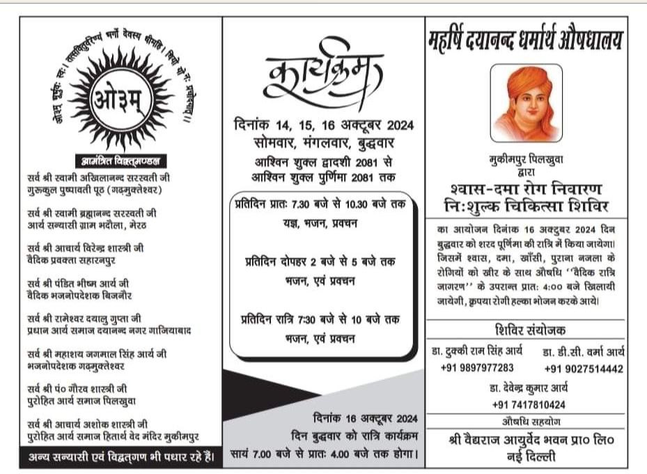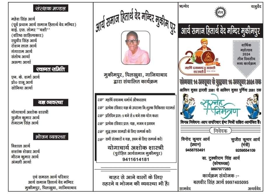 एवं समस्त आर्य परिवार आर्य समाज हितार्थ वेद मन्दिर मुकीमपुर, पिलखुवा, गाजियाबाद