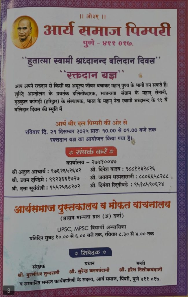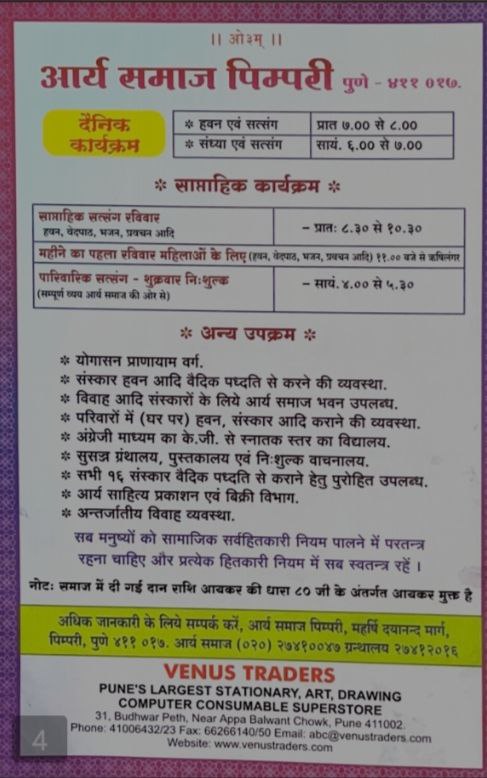 अधिक जानकारी के लिये सम्पर्क करें, आर्य समाज पिम्परी, महर्षि दयानन्द मार्ग, पिम्परी, पुणे ४११ ०१७. आर्य समाज (०२०) २७४१००४७ ग्रन्थालय २७४१२०१६