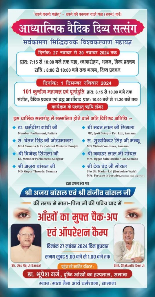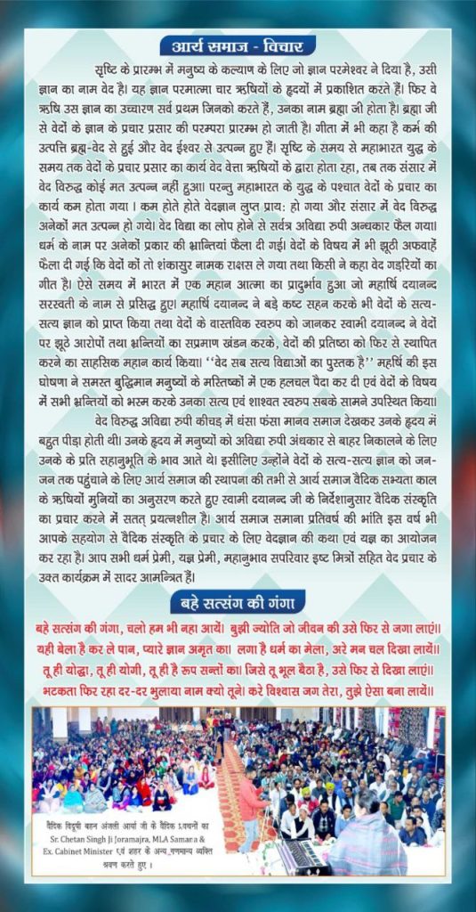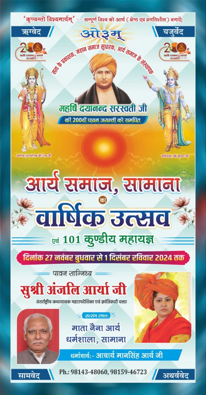 वेद विरुद्ध अविद्या रुपी कीचड़ में धंसा फंसा मानव समाज देखकर उनके हृदय में बहुत पीड़ा होती थी। उनके हृदय में मनुष्यों को अविद्या रुपी अंधकार से बाहर निकालने के लिए उनके के प्रति सहानुभूति के भाव आते थे। इसीलिए उन्होंने वेदों के सत्य-सत्य ज्ञान को जन- जन तक पहुंचाने के लिए आर्य समाज की स्थापना की तभी से आर्य समाज वैदिक सभ्यता काल के ऋषियों मुनियों का अनुसरण करते हुए स्वामी दयानन्द जी के निर्देशानुसार वैदिक संस्कृति का प्रचार करने में सतत् प्रयत्नशील है। आर्य समाज समाना प्रतिवर्ष की भांति इस वर्ष भी आपके सहयोग से वैदिक संस्कृति के प्रचार के लिए वेदज्ञान की कथा एवं यज्ञ का आयोजन कर रहा है। आप सभी धर्म प्रेमी, यज्ञ प्रेमी, महानुभाव सपरिवार इष्ट मित्रों सहित वेद प्रचार के उक्त कार्यक्रम में सादर आमन्त्रित है।