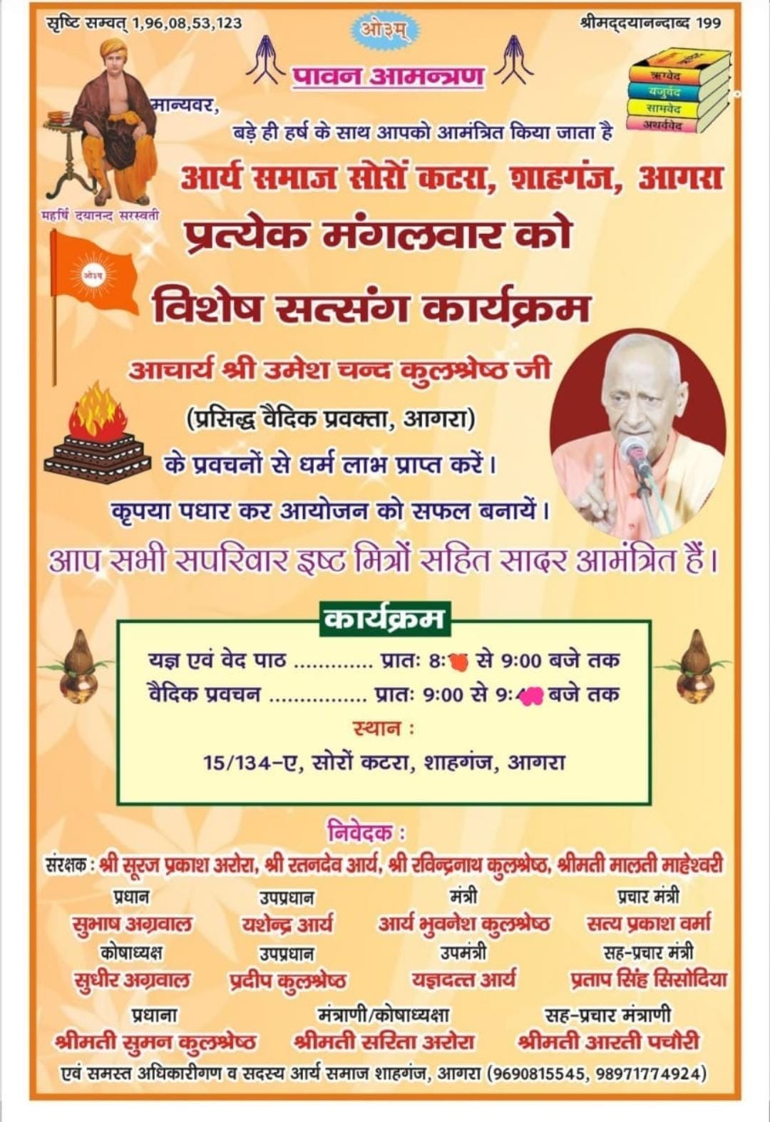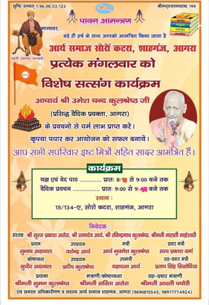 बड़े ही हर्ष के साथ आपको आमंत्रित किया जाता है आर्य समाज सोरों कटरा, शाहगंज, आगरा
