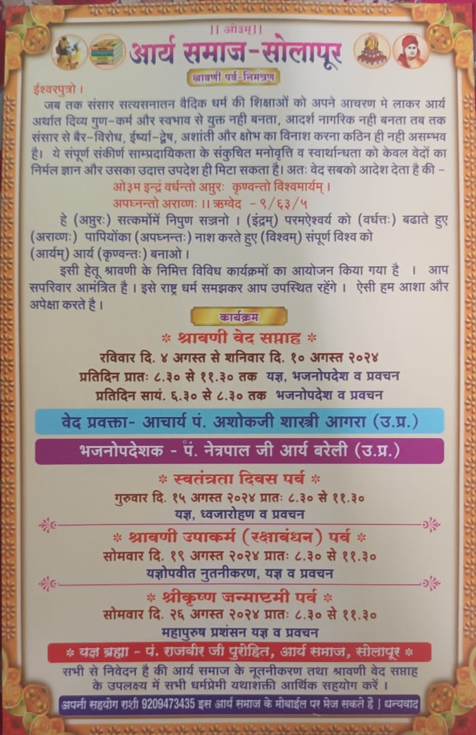 यज्ञ ब्रह्मा पं. राजवीर जी पुरोहित, आर्य समाज, सोलापूरसभी से निवेदन है की आर्य समाज के नूतनीकरण तथा श्रावणी वेद सप्ताहके उपलक्ष्य में सभी धर्मप्रेमी यथाशक्ति आर्थिक सहयोग करें।