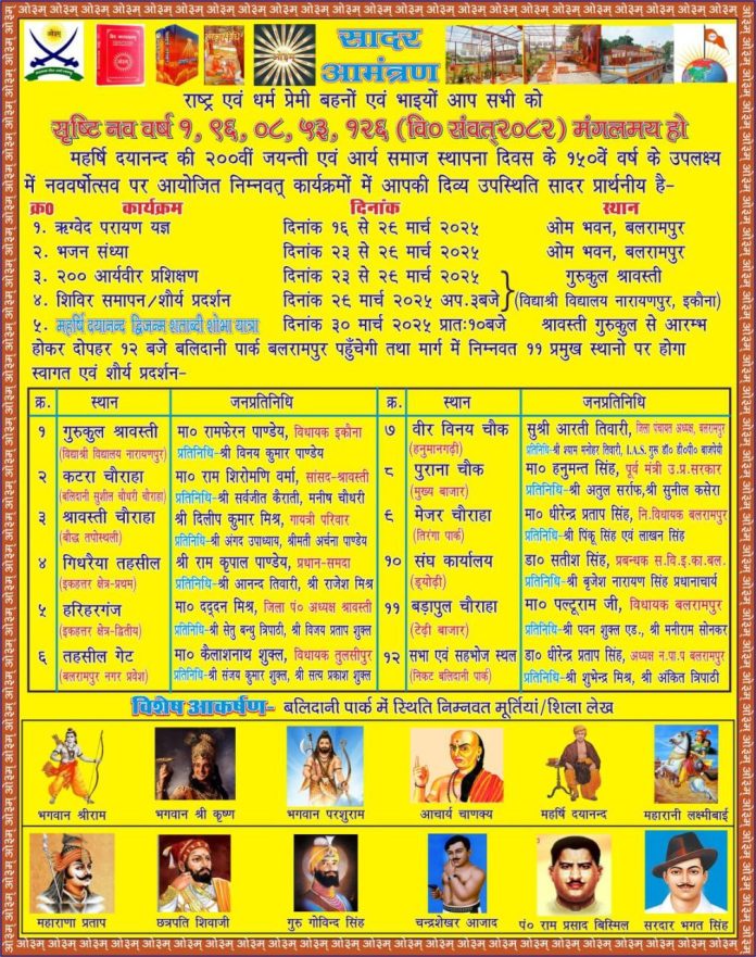 | 5 | महर्षि दयानन्द द्विजन्म शताब्दी शोभा यात्रा | 30 मार्च 2025, प्रातः 10 बजे | बलरामपुर, मार्ग में 11 प्रमुख स्थान |
