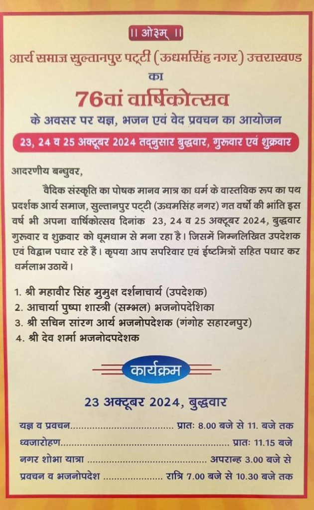 वैदिक संस्कृति का पोषक मानव मात्र का धर्म के वास्तविक रूप का पथ प्रदर्शक आर्य समाज, सुल्तानपुर पट्टी (ऊधमसिंह नगर) गत वर्षों की भांति इस वर्ष भी अपना वार्षिकोत्सव दिनांक 23, 24 व 25 अक्टूबर 2024, बुद्धवार गुरूवार व शुक्रवार को धूमधाम से मना रहा है। जिसमें निम्नलिखित उपदेशक एवं विद्वान पधार रहे हैं। कृपया आप सपरिवार एवं ईष्टमित्रों सहित पधार कर धर्मलाभ उठायें ।