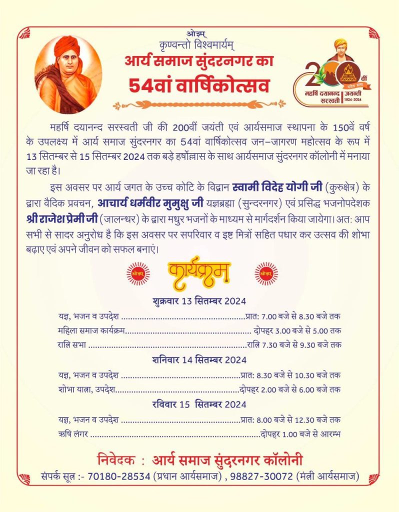 महर्षि दयानन्द सरस्वती जी की 200वीं जयंती एवं आर्यसमाज स्थापना के 150वें वर्ष के उपलक्ष्य में आर्य समाज सुंदरनगर का 54 वां वार्षिकोत्सव जन-जागरण महोत्सव के रूप में 13 सितम्बर से 15 सितम्बर 2024 तक बड़े हर्षोल्लास के साथ आर्यसमाज सुंदरनगर कॉलोनी में मनाया जा रहा है।