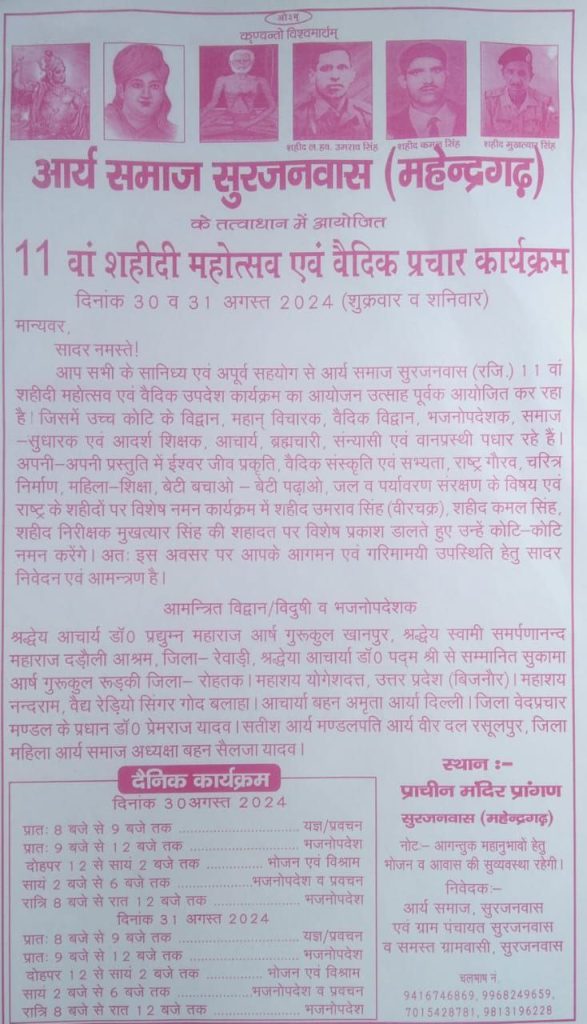 आप सभी के सानिध्य एवं अपूर्व सहयोग से आर्य समाज सुरजनवास (रजि.) 11 वा शहीदी महोत्सव एवं वैदिक उपदेश कार्यक्रम का आयोजन उत्साह पूर्वक आयोजित कर रहा है। जिसमें उच्च कोटि के विद्वान, महान विचारक, वैविक विद्वान, भजनोपदेशक, समाज – सुधारक एवं आदर्श शिक्षक, आचार्य, ब्रह्मचारी, संन्यासी एवं वानप्रस्थी पधार रहे हैं। अपनी-अपनी प्रस्तुति में ईश्वर जीव प्रकृति, वैदिक संस्कृति एवं सभ्यता, राष्ट्र गौरव, चरित्र निर्माण, महिला-शिक्षा, बेटी बचाओ बेटी पढ़ाओ, जल व पर्यावरण संरक्षण के विषय एवं राष्ट्र के शहीदों पर विशेष नमन कार्यक्रम में शहीद उमराव सिंह (वीरचक्र), शहीद कमल सिंह, शहीद निरीक्षक मुखत्यार सिंह की शहादत पर विशेष प्रकाश डालते हुए उन्हें कोटि-कोटि नमन करेंगे। अतः इस अवसर पर आपके आगमन एवं गरिमामयी उपस्थिति हेतु सादर निवेदन एवं आमन्त्रण है।