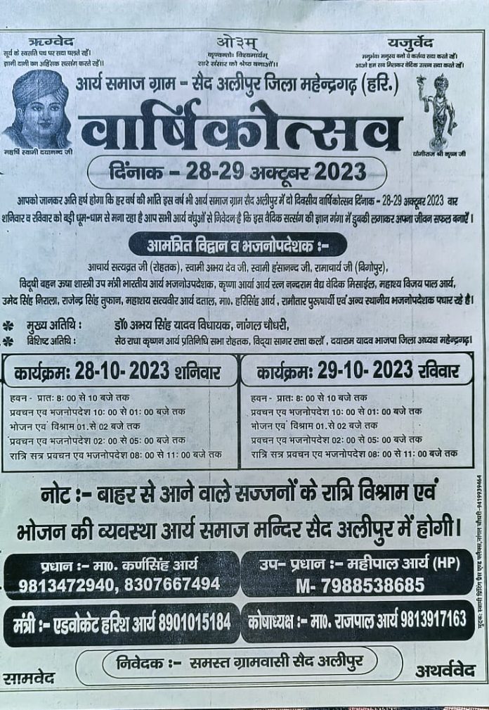 आपको जानकर अति हर्ष होगा कि हर वर्ष की भाँति इस वर्ष भी आर्य समाज ग्राम सैद अलीपुर में दो दिवसीय वार्षिकोत्सव दिनांक – 28-29 अक्टूबर 2023 शनिवार व रविवार को बड़ी धूम-धाम से मना रहा है आप सभी आर्य वधुओं से निवेदन है कि इस वैदिक सत्संग की ज्ञान गंगा में डुबकी लगाकर अपना जीवन सफल बनाएँ ।