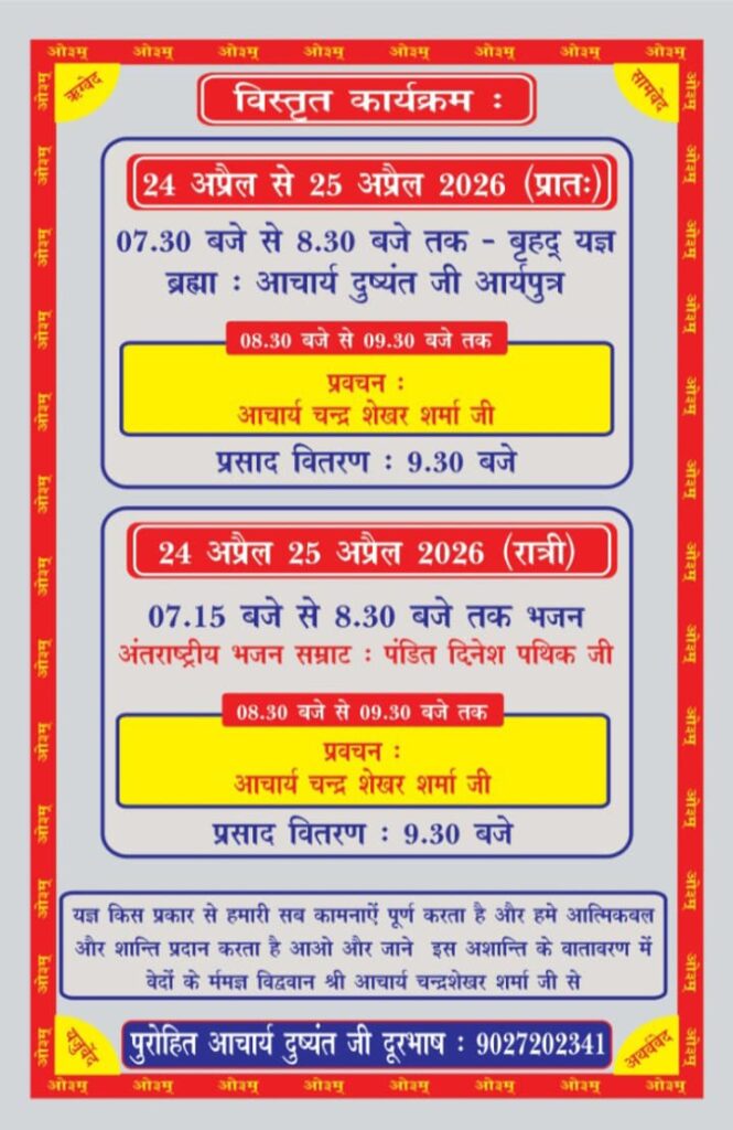 आप सभी से विनम्र निवेदन है कि इस पवित्र आयोजन में अपने परिवार सहित उपस्थित होकर यज्ञ, भजन और प्रवचन का लाभ प्राप्त करें तथा अपने जीवन को आध्यात्मिक ऊर्जा से परिपूर्ण करें।