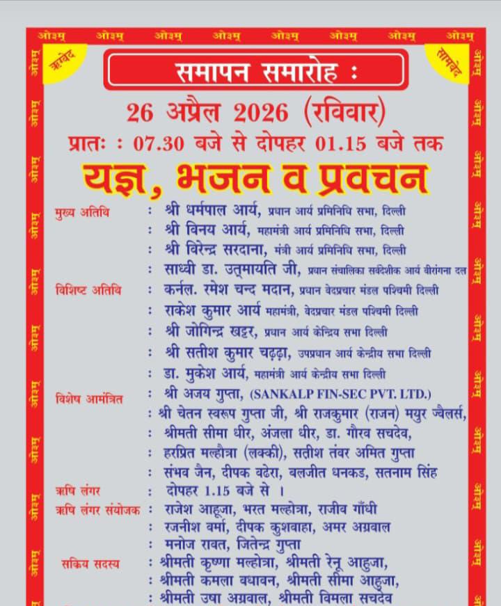 आर्य समाज, जनकपुरी द्वारा वर्ष 2026 का भव्य वार्षिकोत्सव 24, 25 एवं 26 अप्रैल को अत्यंत श्रद्धा, उत्साह और वैदिक परंपराओं के अनुरूप आयोजित किया जा रहा है। यह तीन दिवसीय आयोजन आध्यात्मिक उन्नति, ज्ञान-वर्धन तथा समाज में संस्कारों के प्रसार के उद्देश्य से किया जा रहा है।