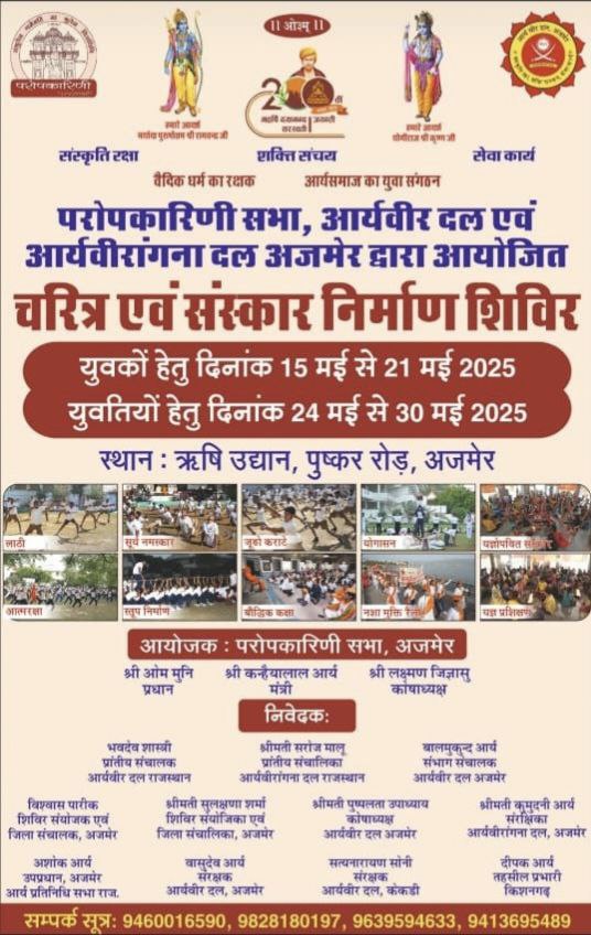 अजमेर, 28 अप्रैल 2025 — वैदिक धर्म के संरक्षण, संस्कृति रक्षा, शक्ति संचय और सेवा कार्यों के प्रति युवाओं में जागरूकता बढ़ाने के उद्देश्य से परोपकारिणी सभा, आर्यवीर दल एवं आर्यवीरांगना दल, अजमेर द्वारा एक भव्य चरित्र एवं संस्कार निर्माण शिविर का आयोजन किया जा रहा है। यह शिविर ऋषि उद्यान, पुष्कर रोड, अजमेर स्थित परिसर में संपन्न होगा।