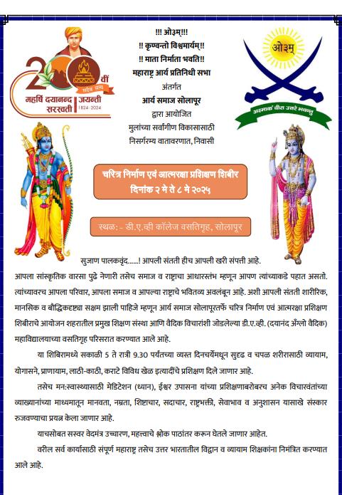 आर्य समाज सोलापुर के सौजन्य से “चिरंजीव निर्माण एवं आत्मरक्षा शिक्षण शिविर” का भव्य आयोजन किया जा रहा है। यह आयोजन डी.ए.वी. (दयानंद अँग्लो वैदिक) महाविद्यालय के छात्रावास परिसर में संपन्न होगा।