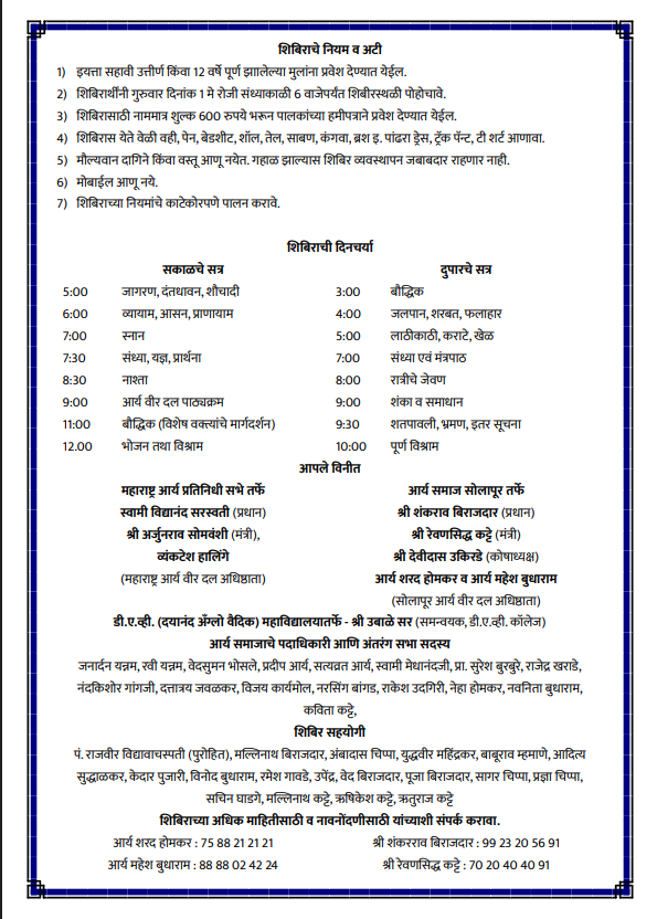 यह शिविर न केवल बच्चों के लिए प्रेरणास्पद अनुभव होगा, बल्कि उन्हें शारीरिक दक्षता, मानसिक संतुलन और सामाजिक दायित्वों की दिशा में सशक्त बनाएगा। आर्य समाज सोलापुर की यह पहल निश्चित रूप से आनेवाली पीढ़ी के लिए एक मजबूत नींव का कार्य करेगी।