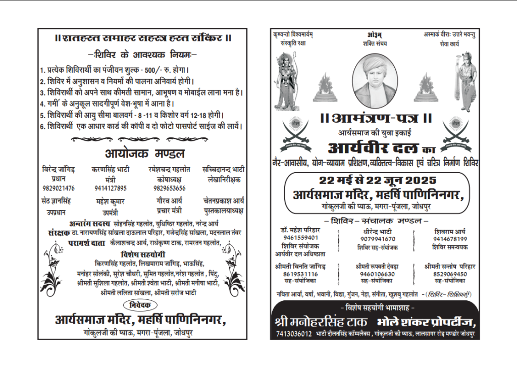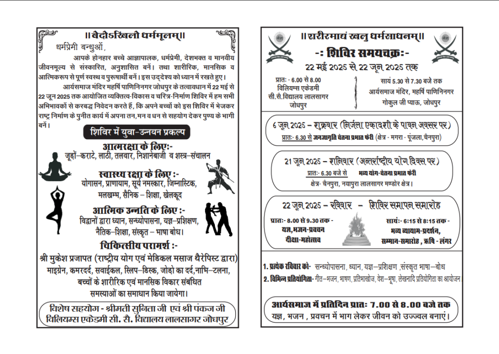 📍 स्थान: आर्यसमाज मंदिर, महर्षि पाणिनिनगर, गोकुलजी की प्याऊ, मगरा-पूंजला, जोधपुर