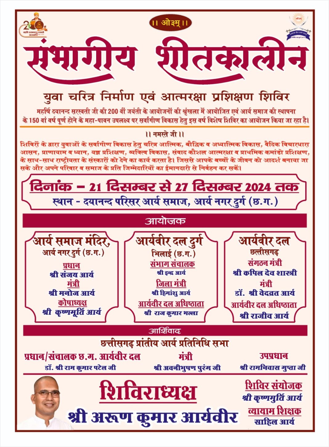 महर्षि दयानन्द सरस्वती जी की 200 वीं जयंती के आयोजनों की श्रृंखला में आयोजित एवं आर्य समाज की स्थापना के 150 वां वर्ष पूर्ण होने के महा-पावन उपलक्ष्य पर सर्वांगीण विकास हेतु इस वर्ष विशेष शिविर का आयोजन किया जा रहा है।