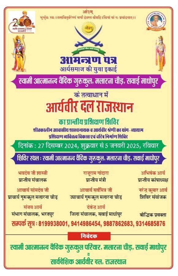 शिविर स्थल : स्वामी आत्मानन्द वैदिक गुरुकुल, मलारना चौड़, सवाई माधोपुर