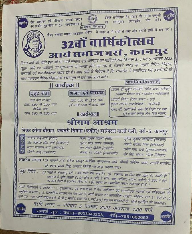विगत वर्षों की भाँति इस वर्ष भी आर्य समाज बर्रा, कानपुर का वार्षिकोत्सव दिनांक 3. 4 एवं 5 नवम्बर 2023 (शुक्र. शनि एवं रविवार) को धूम-धाम से सम्पन्न होने जा रहा है, जिसमें भारत के महान वैदिक विद्वान, सन्यासी एवं भजनोपदेशक पधार रहे हैं। आप सभी से निवेदन है कि समारोह में सपरिवार एवं इष्टमित्रों के साथ पधारकर वैदिक विद्वानों के वचनामृत से धर्म लाभ प्राप्त करें।