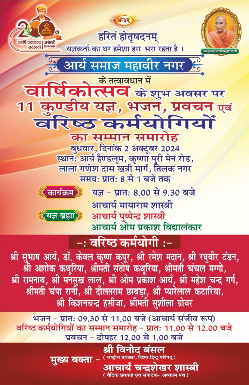 आर्य समाज महावीर नगर के तत्वावधान में 11 कुण्डीय यज्ञ, भजन, प्रवचन एवं वरिष्ठ कर्मयोगियों का सम्मान समारोह