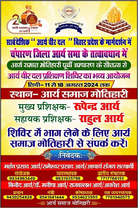 शिविर में भाग लेने के लिए आर्य समाज मोतिहारी से संपर्क करें।