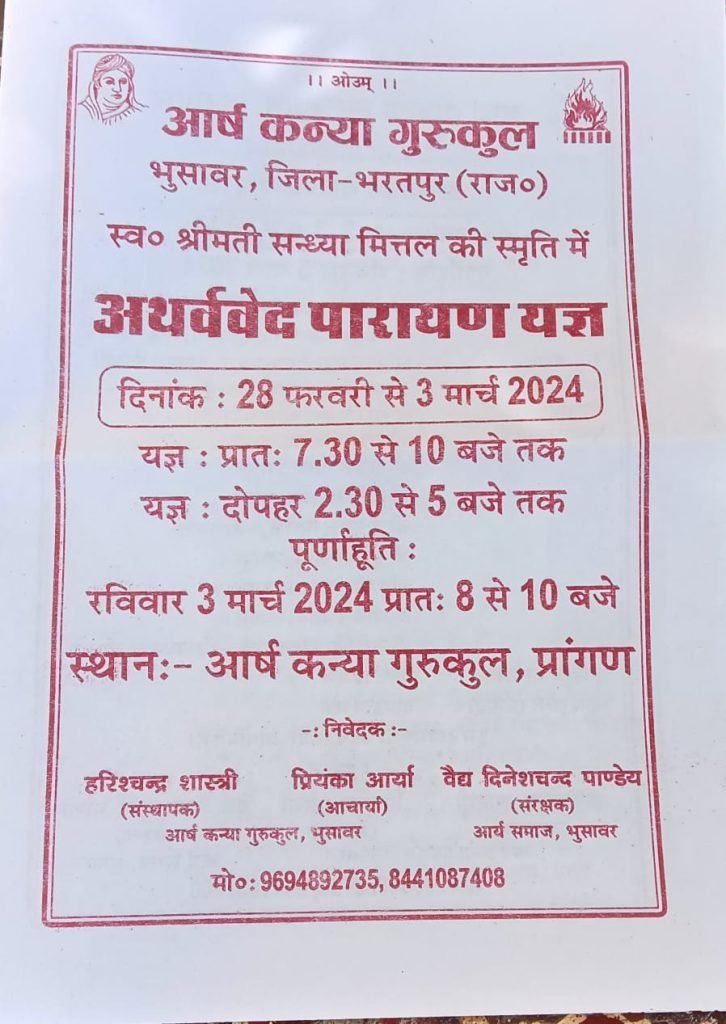 अथर्ववेद पारायण यज्ञ आर्ष कन्या गुरुकुल भुसावर, जिला-भरतपुर