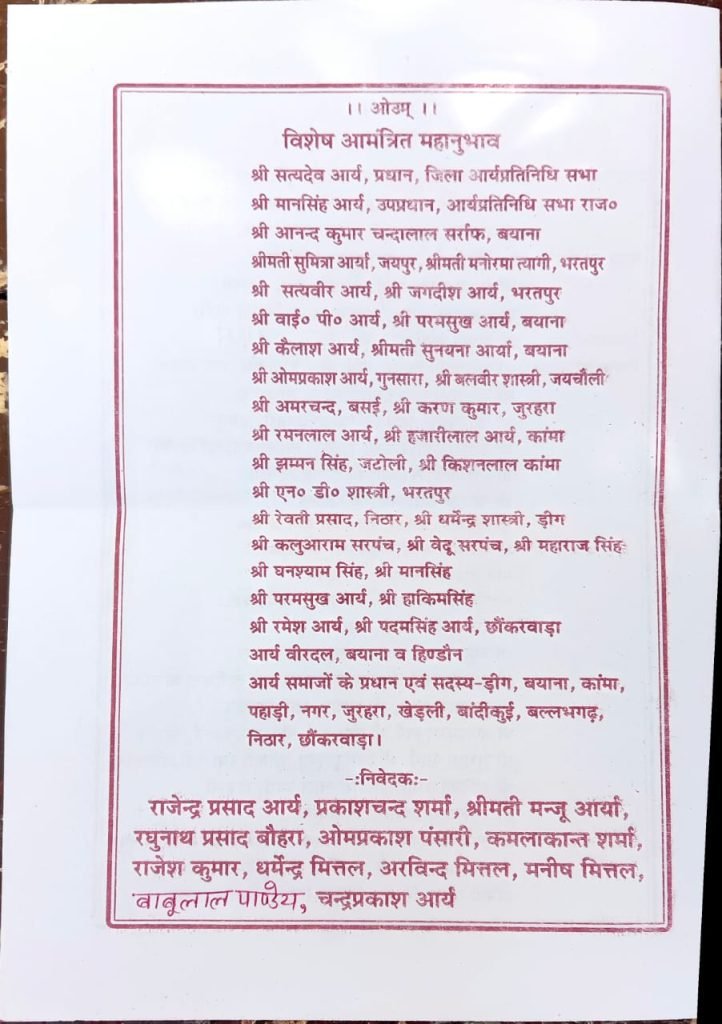श्री सत्यदेव आर्य, प्रधान, जिला आर्यप्रतिनिधि सभा श्री मानसिंह आर्य, उपप्रधान, आर्यप्रतिनिधि सभा राज० श्री आनन्द कुमार चन्दालाल सर्राफ, बयाना श्रीमती सुमित्रा आर्या, जयपुर, श्रीमती मनोरमा त्यागी, भरतपुर श्री सत्यवीर आर्य, श्री जगदीश आर्य, भरतपुर श्री वाई० पी० आर्य, श्री परमसुख आर्य, बयाना श्री कैलाश आर्य, श्रीमती सुनयना आर्या, बयाना श्री ओमप्रकाश आर्य, गुनसारा, श्री बलवीर शास्त्री, जयचौली श्री अमरचन्द, बसई, श्री करण कुमार, जुरहरा श्री रमनलाल आर्य, श्री हजारीलाल आर्य, कांमा श्री झम्मन सिंह, जटोली, श्री किशनलाल कांमा श्री एन० डी० शास्त्री, भरतपुर श्री रेवती प्रसाद, निठार, श्री धर्मेन्द्र शास्त्री, ड़ीग श्री कलुआराम सरपंच, श्री वेदू सरपंच, श्री महाराज सिंह श्री घनश्याम सिंह, श्री मानसिंह श्री परमसुख आर्य, श्री हाकिमसिंह श्री रमेश आर्य, श्री पदमसिंह आर्य, छौंकरवाड़ा आर्य वीरदल, बयाना व हिण्डौन आर्य समाजों के प्रधान एवं सदस्य-ड़ीग, बयाना, कांमा, पहाड़ी, नगर, जुरहरा, खेड़ली, बांदीकुई, बल्लभगढ़, निठार, छौंकरवाड़ा।