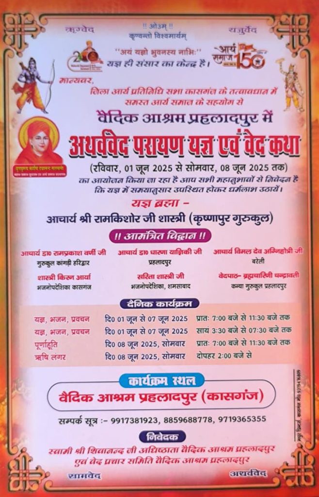 कासगंजजिला आर्य प्रतिनिधि सभा कासगंज के तत्वावधान में तथा समस्त आर्य समाज के सहयोग से वैदिक आश्रम, प्रहलादपुर में दिनांक 01 जून 2025 (रविवार) से 08 जून 2025 (सोमवार) तक अथर्ववेद परायण यज्ञ एवं वेद कथा का आयोजन किया जा रहा है। इस वैदिक अनुष्ठान में सभी श्रद्धालुजन सादर आमंत्रित हैं।