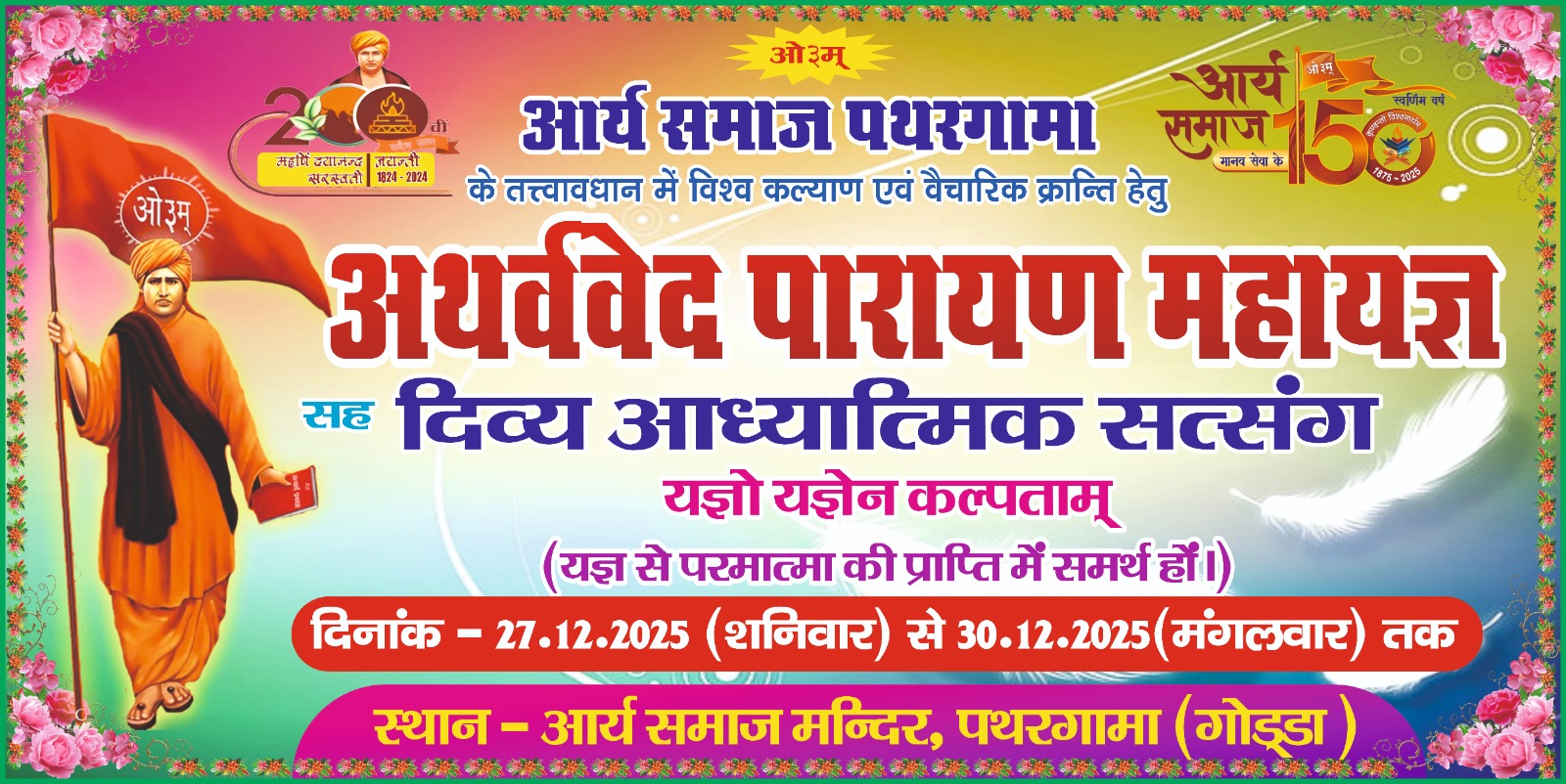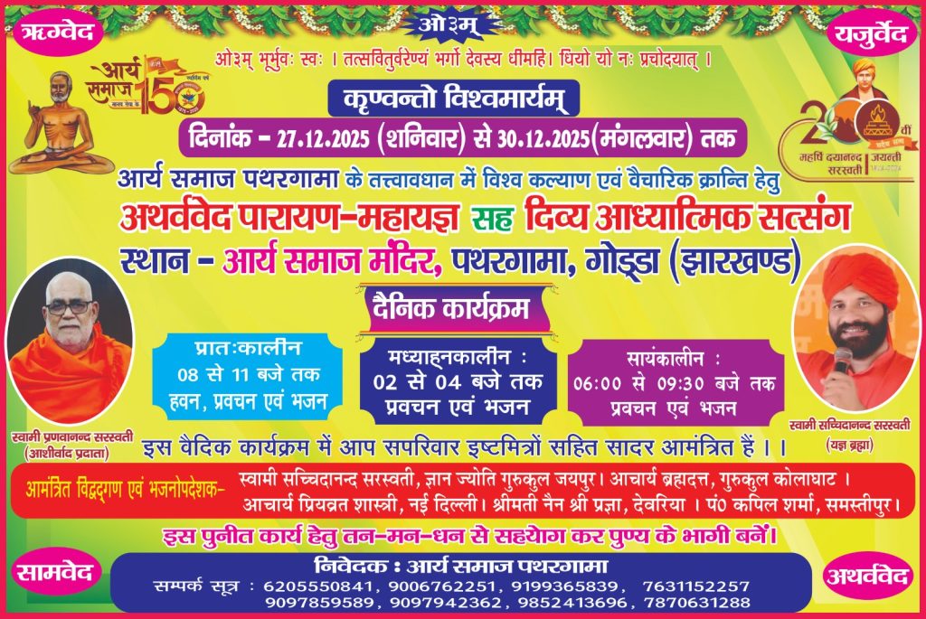 आर्य समाज पथरगामा, हर वर्ष की भाँति, इस वर्ष भी विश्व कल्याण हेतु अथर्ववेद पारायण महायज्ञ तथा वैचारिक क्रान्ति हेतु दिव्य आध्यात्मिक सत्संग का भव्य आयोजन कर रहा है, जो 27.12.2025 (शनिवार) से 30.12.2025 (मंगलवार) तक सम्पन्न होगा।
