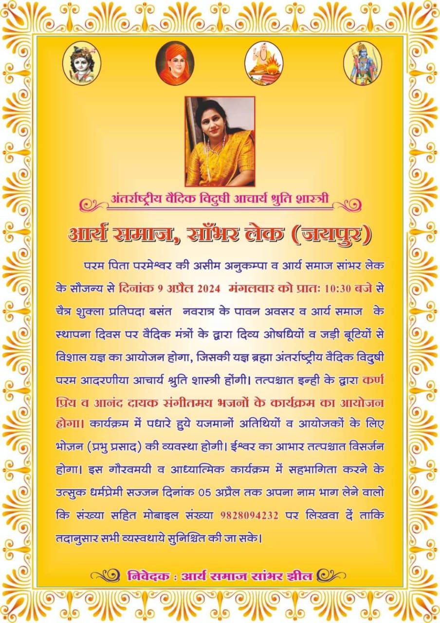 परम पिता परमेश्वर की असीम अनुकम्पा व आर्य समाज सांभर लेक के सौजन्य से दिनांक 9 अप्रैल 2024 मंगलवार को प्रातः 10:30 बजे से चैत्र शुक्ला प्रतिपदा बसंत नवरात्र के पावन अवसर व आर्य समाज के स्थापना दिवस पर वैदिक मंत्रों के द्वारा दिव्य ओषधियों व जड़ी बूटियों से विशाल यज्ञ का आयोजन होगा, जिसकी यज्ञ ब्रह्मा अंतर्राष्ट्रीय वैदिक विदुषी परम आदरणीया आचार्य श्रुति शास्त्री होंगी। तत्पश्चात इन्ही के द्वारा कर्ण प्रिय व आनंद दायक संगीतमय भजनों के कार्यक्रम का आयोजन होगा। कार्यक्रम में पधारे हुये यजमानों अतिथियों व आयोजकों के लिए भोजन (प्रभु प्रसाद) की व्यवस्था होगी। ईश्वर का आभार तत्पश्चात विसर्जन होगा। इस गौरवमयी व आध्यात्मिक कार्यक्रम में सहभागिता करने के उत्सुक धर्मप्रेमी सज्जन दिनांक 05 अप्रैल तक अपना नाम भाग लेने वालो कि संख्या सहित मोबाइल संख्या 9828094232 पर लिखवा दें ताकि तदानुसार सभी व्यस्वथाये सुनिश्चित की जा सके।