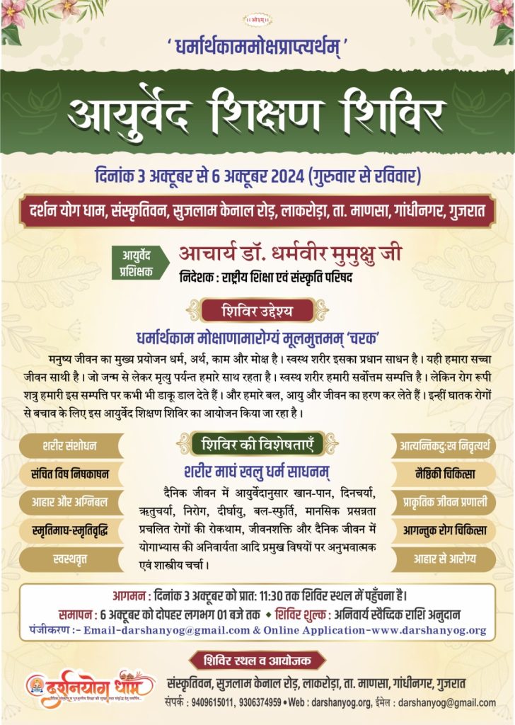 धर्मार्थकाम मोक्षाणामारोग्यं मूलमुत्तमम् ‘चरक’मनुष्य जीवन का मुख्य प्रयोजन धर्म, अर्थ, काम और मोक्ष है। स्वस्थ शरीर इसका प्रधान साधन है। यही हमारा सच्चा जीवन साथी है। जो जन्म से लेकर मृत्यु पर्यन्त हमारे साथ रहता है। स्वस्थ शरीर हमारी सर्वोत्तम सम्पत्ति है। लेकिन रोग रूपी शत्रु हमारी इस सम्पत्ति पर कभी भी डाकू डाल देते हैं। और हमारे बल, आयु और जीवन का हरण कर लेते हैं। इन्हीं घातक रोगों से बचाव के लिए इस आयुर्वेद शिक्षण शिविर का आयोजन किया जा रहा है।