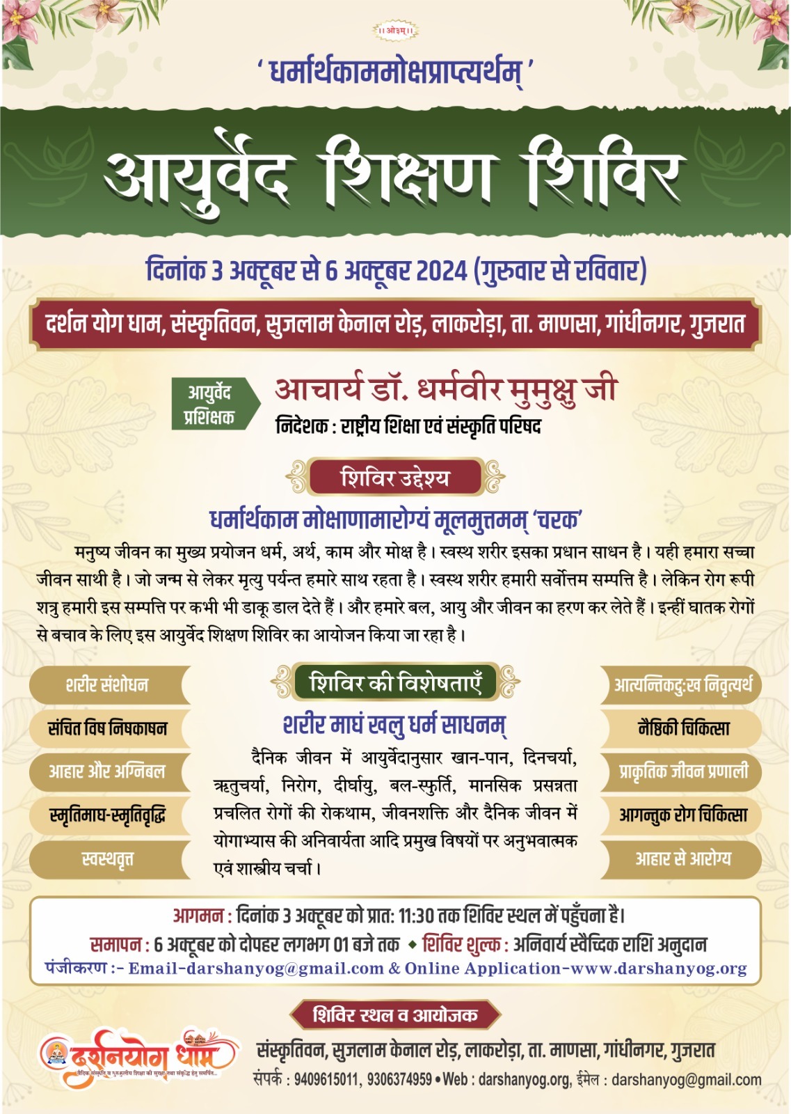 दर्शन योग धाम, संस्कृतिवन, सुजलाम केनाल रोड़, लाकरोड़ा, ता. माणसा, गांधीनगर, गुजरातआयुर्वेद प्रशिक्षकआचार्य डॉ. धर्मवीर मुमुक्षु जी