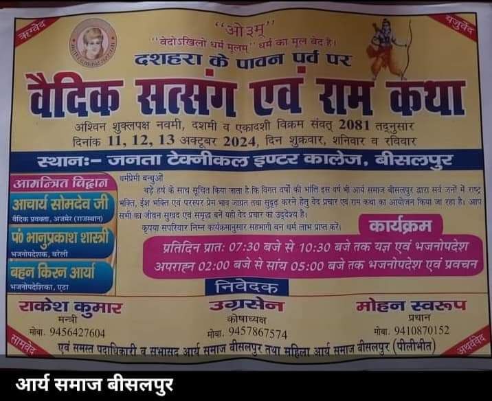 बड़े हर्ष के साथ सूचित किया जाता है कि विगत वर्षों की भांति इस वर्ष भी आर्य समाज बीसलपुर द्वारा सर्व जनों में राष्ट्र भक्ति, ईश भक्ति एवं परस्पर प्रेम भाव जाग्रत तथा सुदृढ़ करने हेतु वेद प्रचार एवं राम कथा का आयोजन किया जा रहा है। आप सभी का जीवन सुखद एवं समृद्ध बने यही वेद प्रचार का उद्देश्य है।
