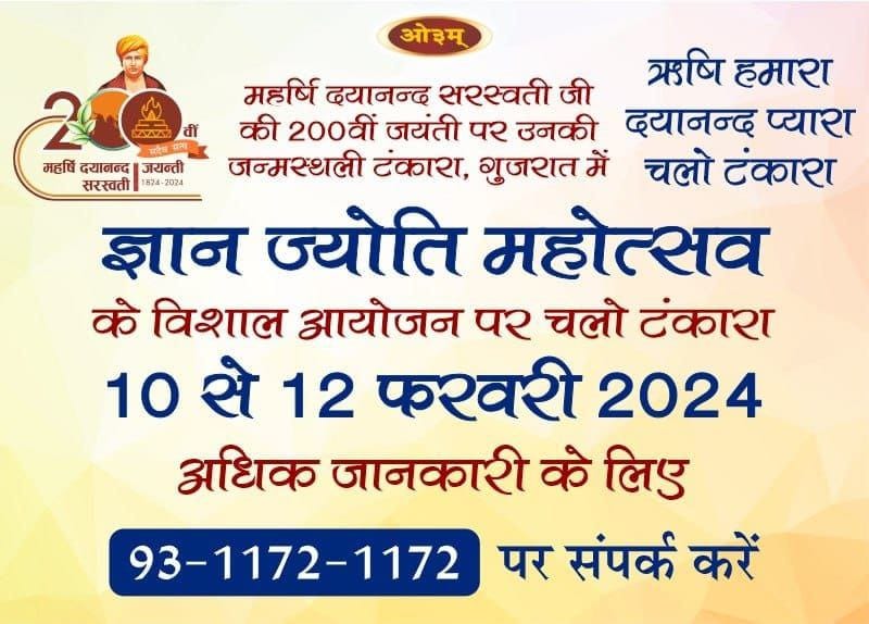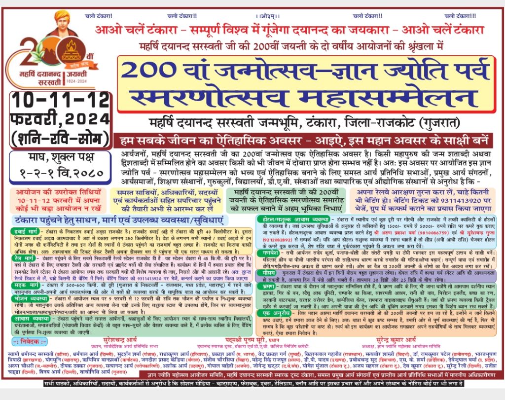 आर्यजनों! महर्षि दयानन्द सरस्वती जी का 200वां जन्मोत्सव एक ऐतिहासिक अवसर है। किसी महापुरुष की जन्म शताब्दी अथवा द्विशताब्दी में सम्मिलित होने का अवसर किसी को भी जीवन में दोबारा प्राप्त होना सम्भव नहीं है। अतः इस अवसर पर आयोजित इस ज्ञान ज्योति पर्व – स्मरणोत्सव महासम्मेलन को भव्य एवं ऐतिहासिक बनाने के लिए समस्त आर्य प्रतिनिधि सभाओं, प्रमुख आर्य संगठनों, आर्यसमाजों, शिक्षण संस्थानों, गुरुकुलों, विद्यालयों, डी.ए.वी. संस्थाओं तथा व्यापारिक एवं औद्योगिक संस्थानों से अनुरोध है कि –