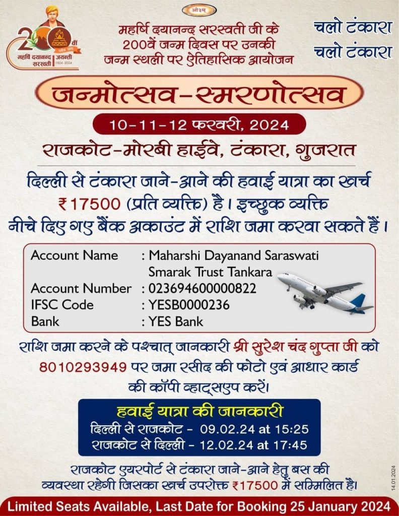 आयोजन की उपरोक्त तिथियों 10-11-12 फरवरी में अपना कोई भी बड़ा आयोजन न रखें समस्त साथियों, अधिकारियों, सदस्यों एवं कार्यकर्ताओं सहित सपरिवार पहुंचने की तैयारी अभी से आरम्भ कर लें महर्षि दयानन्द सरस्वती जी की 200वीं जयन्ती के ऐतिहासिक स्मरणोत्सव समारोह को सफल बनाने में अहम् भूमिका निभायें।
