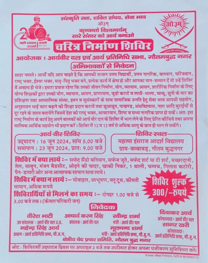 सादर नमस्ते। आर्यों यदि आप चाहते है कि आपकी सन्तान उत्तम विद्यार्थी, उत्तम नागरिक, बलवान, चरित्रवान, राष्ट्र भक्त, ईश्वर भक्त, मातृ-पितृ भक्त बने, प्रत्येक कार्य में श्रेष्ठ हो और आपका मान-सम्मान दें तो उन्हें शिविर में अवश्य ही भेजे। हमारा प्रयास रहेगा कि उनको जीवन निर्माण, योग, व्यायाम, आसन, शारीरिक निर्माण के लिए योग्य शिक्षकों द्वारा उनको योग, व्यायाम, आसन, प्राणायाम, जूडो कराटे व लाठी-भाला, चाकू, छुनी के वार का | प्रशिक्षण तथा आध्यात्मिक संध्या, हवन व सुसंस्कारों के साथ सामाजिक उन्नति हेतु सेवा भाव आपसी सहयोग, अनुशासन भाई चारा बढ़ाने की शिक्षा प्रदान करायें तथा छुआछूत, पाखण्ड, अंधविश्वास, नशा आदि बुराईयों से दूर रहने के उपाय बतायेंगे जिसमें देश को राष्ट्र भक्त, आचारवान, शिष्ट व सभ्य नागरिक प्राप्त हो सकें। अतः इस राष्ट्र निर्माण के कार्य हेतु अपने बालकों को आर्य वीर दल के शिविर में भाग लेने के लिए प्रेरित कीजिये तथा अपना | सात्विक आर्थिक सहयोग भी प्रदान करें। शिविर में 12 व 12 वर्ष से अधिक आयु के छात्र ही भाग ले सकेंगे।
