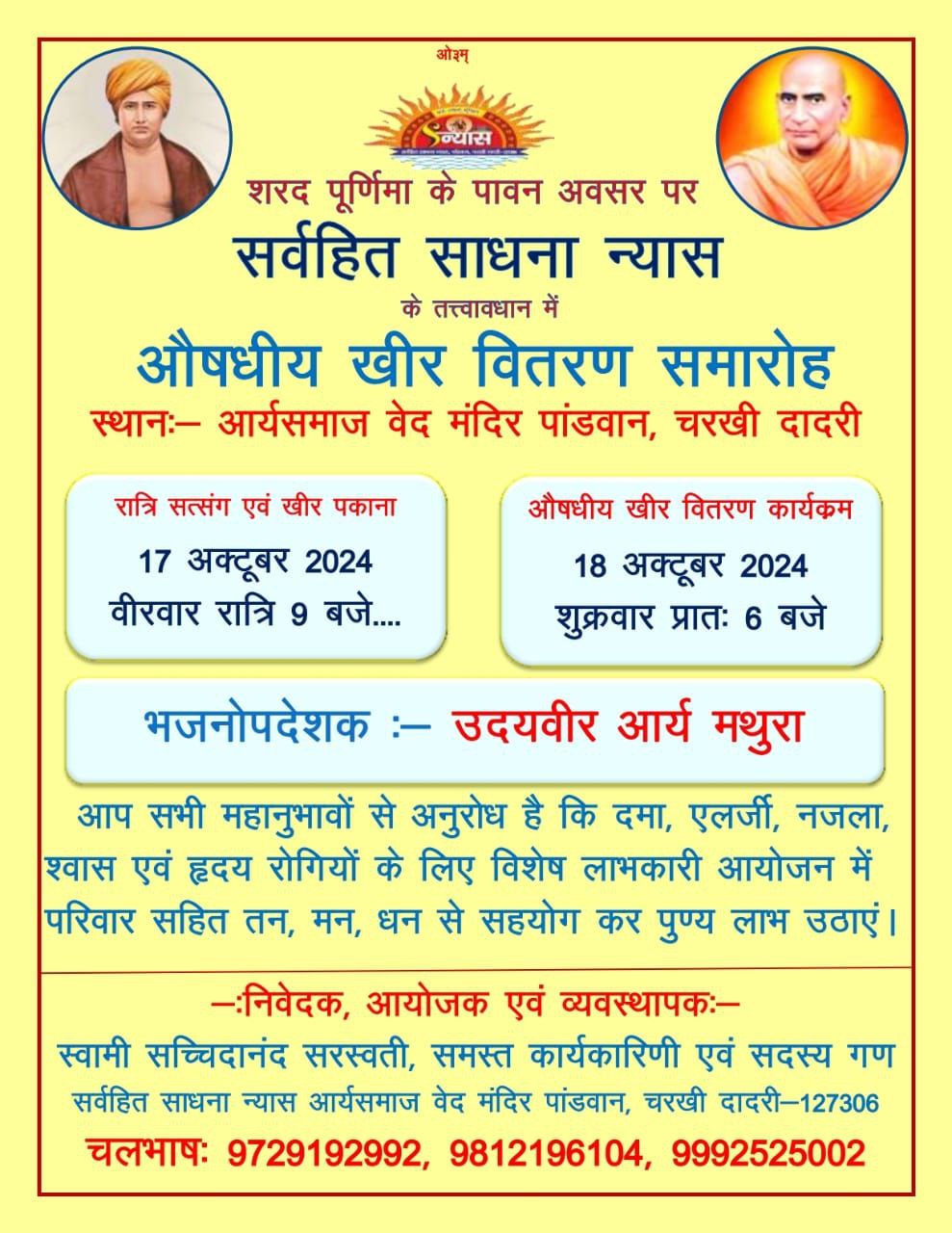 -: निवेदक, आयोजक एवं व्यवस्थापकः- स्वामी सच्चिदानंद सरस्वती, समस्त कार्यकारिणी एवं सदस्य गण सर्वहित साधना न्यास आर्यसमाज वेद मंदिर पांडवान, चरखी दादरी-127306