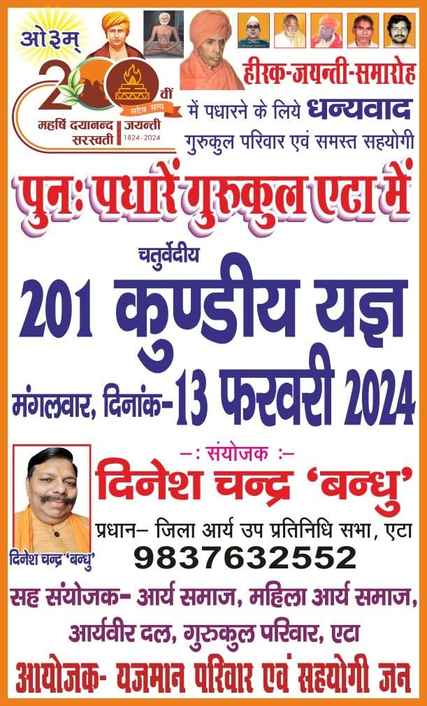 आर्य समाज हीरक जयन्ती-समारोह चतुर्वेदीय 201 कुण्डीय यज्ञ By Shekhar Arya - February 1, 2024 0 26 FacebookTwitterPinterestWhatsApp पुनः पधारें गुरुकुल एटा में Table of Contents Toggle मंगलवार, दिनांक 13 फरवरी 2024संयोजक :- दिनेश चन्द्र ‘बन्धु’सह संयोजक- आर्य समाज, महिला आर्य समाजCurent posts: मंगलवार, दिनांक 13 फरवरी 2024 संयोजक :- दिनेश चन्द्र ‘बन्धु’ प्रधान- जिला आर्य उप प्रतिनिधि सभा, एटा 9837632552 सह संयोजक- आर्य समाज, महिला आर्य समाज आर्यवीर दल, गुरुकुल परिवार, एटा आयोजक- यजमान परिवार एवं सहयोगी जन Curent posts: मानवता को महर्षि मनु की देन औरंगज़ेब और इतिहास ज्ञान घोटाला वेदों में राष्ट्रवाद गुरु नानक के गुरुपर्व पर अलगाववादी सिखों को गुरु ग्रन्थ साहिब की सीख क्या वेदों में पशुबलि, माँसाहार आदि का विधान है?भाग 1 सन्त रविदास का वास्तविक स्वरूप क्या ईश्वर जीव के भविष्य में करने वाले कर्मों को जानता है चार दिवसीय वार्षिकोत्सव एवं ज्ञानयज्ञ ध्यान योग साधना प्रशिक्षण शिविर सत्य सनातन वैदिक धर्म परीक्षा