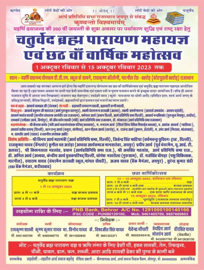 मीडिया प्रभारी कैलाशचन्द आर्य, आर्य समाज मिशन चैनल, जोधपुर, मो. 8949465958