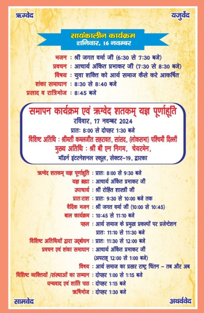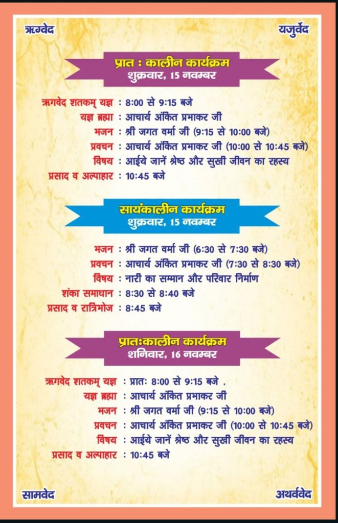 ऋगवेद शतकम् यज्ञ पूर्णाति, वैदिक भजन एवं प्रवचन, बाल सास्कृतिक कार्यकम, आर्य समाज के प्रकल्पों की झलका, विशिष्ट वक्ताओं का उद्बोधन एवं ऋषि लंगर