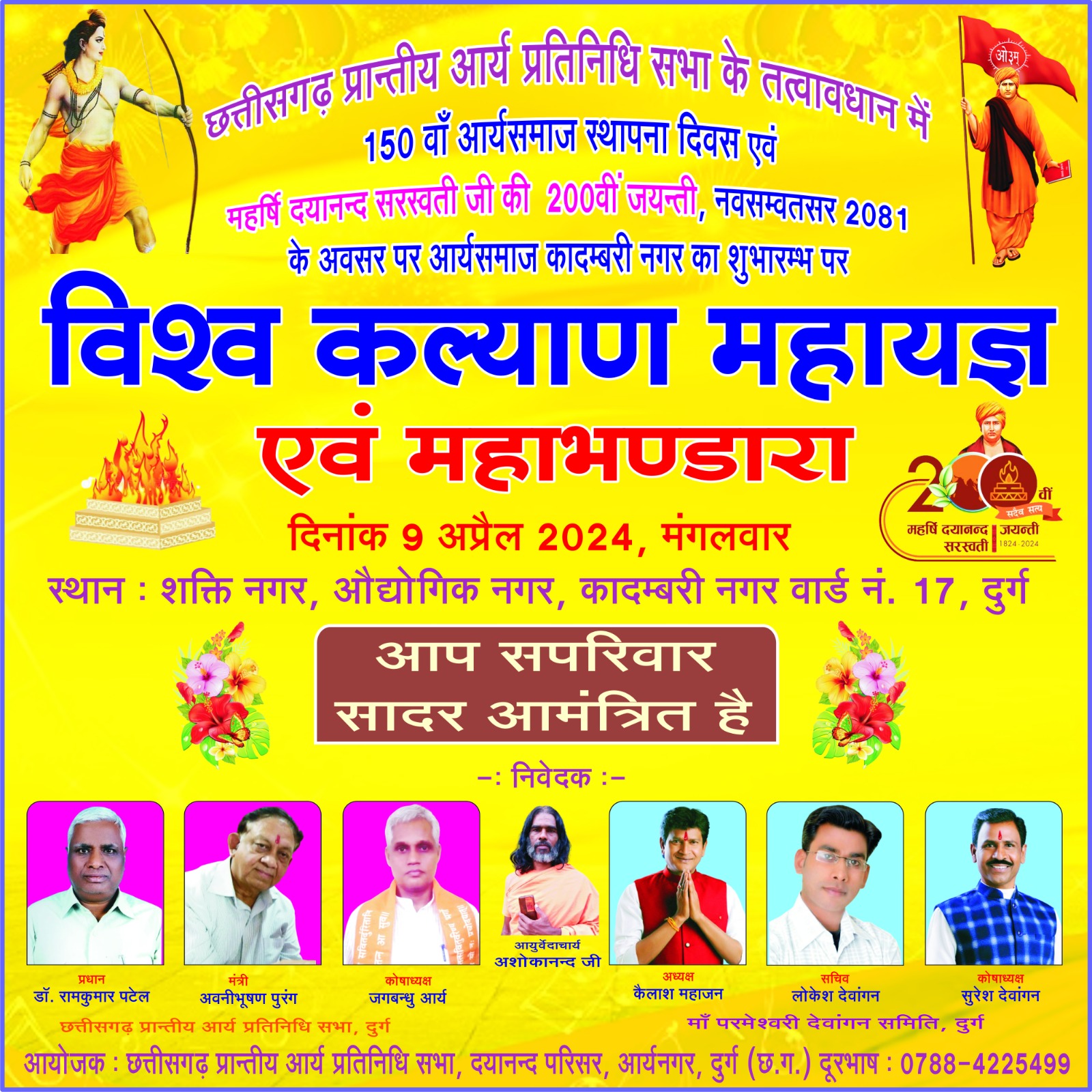 निवेदक :- प्रधान डॉ. रामकुमार पटेल मंत्री अवनीभूषण पुरंग कोषाध्यक जगबन्धु आर्य आयुर्वेदाचार्य अशोकानन्द जी अध्यक्ष कैलाश महाजन सचिव लोकेश देवांगन कोषाध्यक्ष सुरेश देवांगन छत्तीसगढ़ प्रान्तीय आर्य प्रतिनिधि सभा, दुर्ग माँ परमेश्वरी देवांगन समिति, दुर्ग