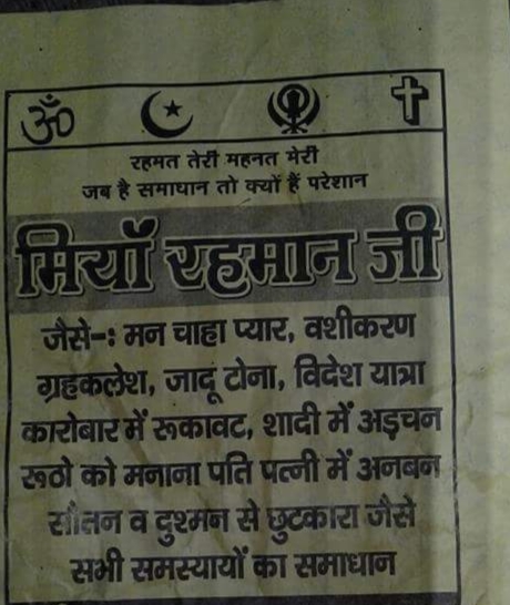 जब भी आप बस या रेलगाड़ी में बैठतें है तो आपको वहा पर कुछ पर्चे लगे हुए मिलेंगे जिन पर लिखा हुआ मिलेगा बंगाली ख़ान बाबा या रहमान मिया आदि। उन पर साई बाबा की फोटो भी दिखाई देगी और उस पर आगे लिखा मिलेगा- गृह कलेश, प्यार में नाकामी, बच्चे पैदा ना होना,परीक्षा में फैल होना, मूठ करनी, वशीकरण आदि के लिए सम्पर्क करें।