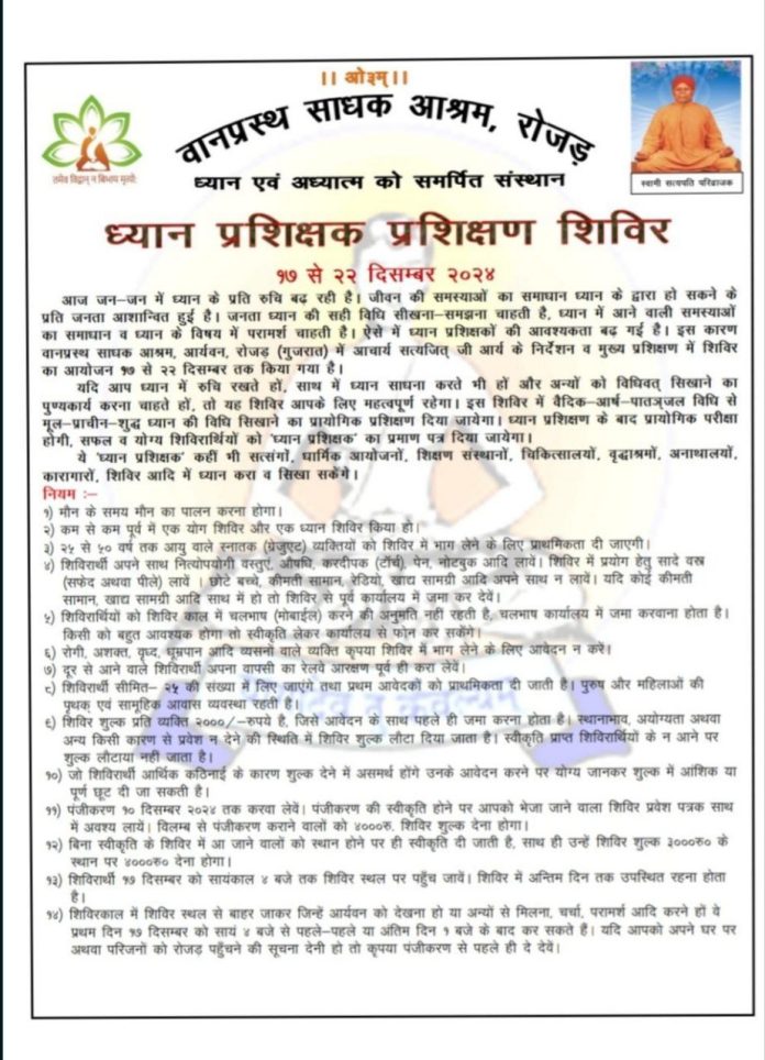 आज जन-जन में ध्यान के प्रति रुचि बढ़ रही है। जीवन की समस्याओं का समाधान ध्यान के द्वारा हो सकने के प्रति जनता आशान्वित हुई है। जनता ध्यान की सही विधि सीखना समझना चाहती है, ध्यान में आने वाली समस्याओं का समाधान व ध्यान के विषय में परामर्श चाहती है। ऐसे में ध्यान प्रशिक्षकों की आवश्यकता बढ़ गई है। इस कारण वानप्रस्थ साधक आश्रम, आर्यवन, रोजड़ (गुजरात) में आचार्य सत्यजित् जी आर्य के निर्देशन व मुख्य प्रशिक्षण में शिविर का आयोजन १७ से २२ दिसम्बर तक किया गया है।