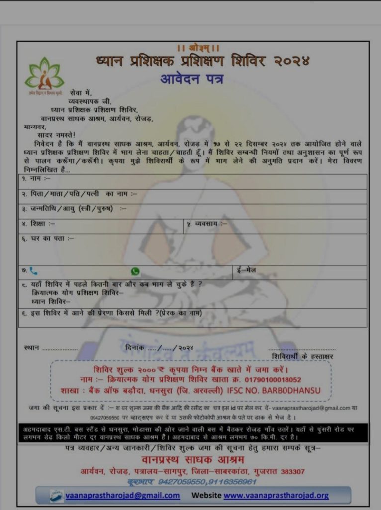ध्यान प्रशिक्षक प्रशिक्षण शिविर, वानप्रस्थ साधक आश्रम, रोजड़