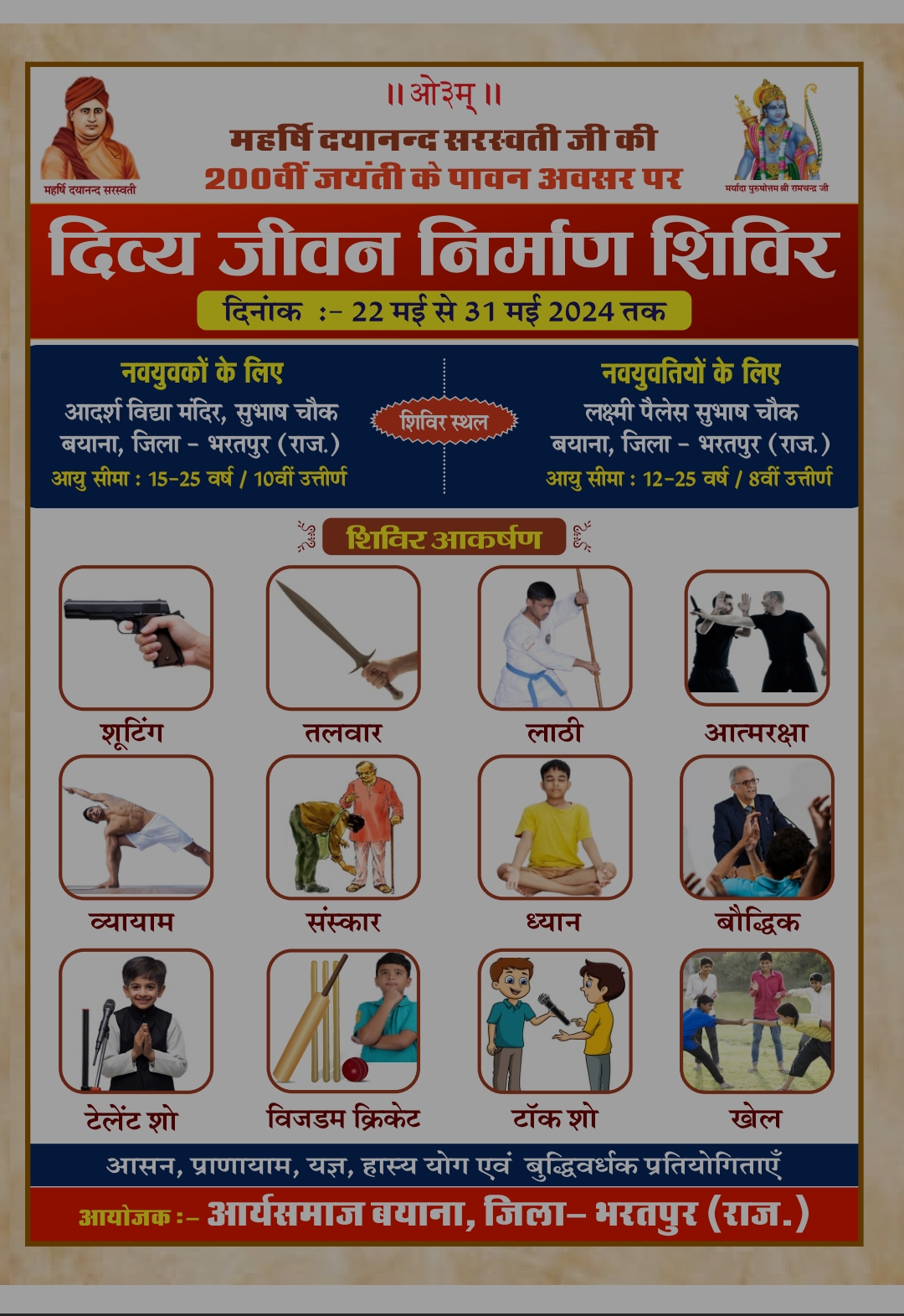 31 मई 2024, शुक्रवार, सायं 4.30-7.30 बजे तक स्थान : लक्ष्मी पैलेस, बयाना विशेष : व्यायाम प्रदर्शन, सांस्कृतिक कार्यक्रम एवं 21 कुण्डीय यज्ञ