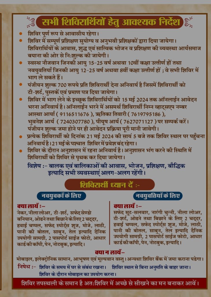 • शिविर में सम्पूर्ण प्रशिक्षण सुयोग्य व अनुभवी प्रशिक्षकों द्वारा दिया जायेगा। शिविरार्थियों के आवास, शुद्ध एवं सात्विक भोजन व प्रशिक्षण की व्यवस्था आर्यसमाज बयाना की ओर से निःशुल्क की जायेगी।