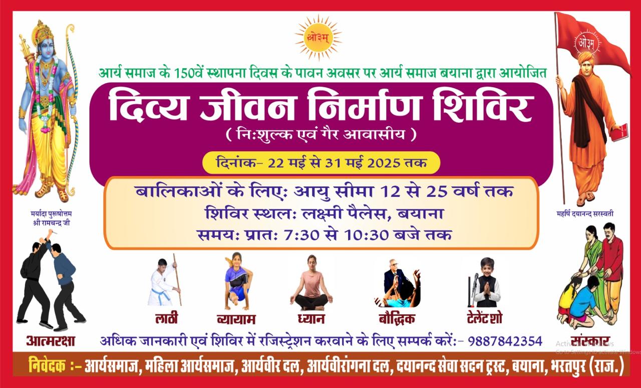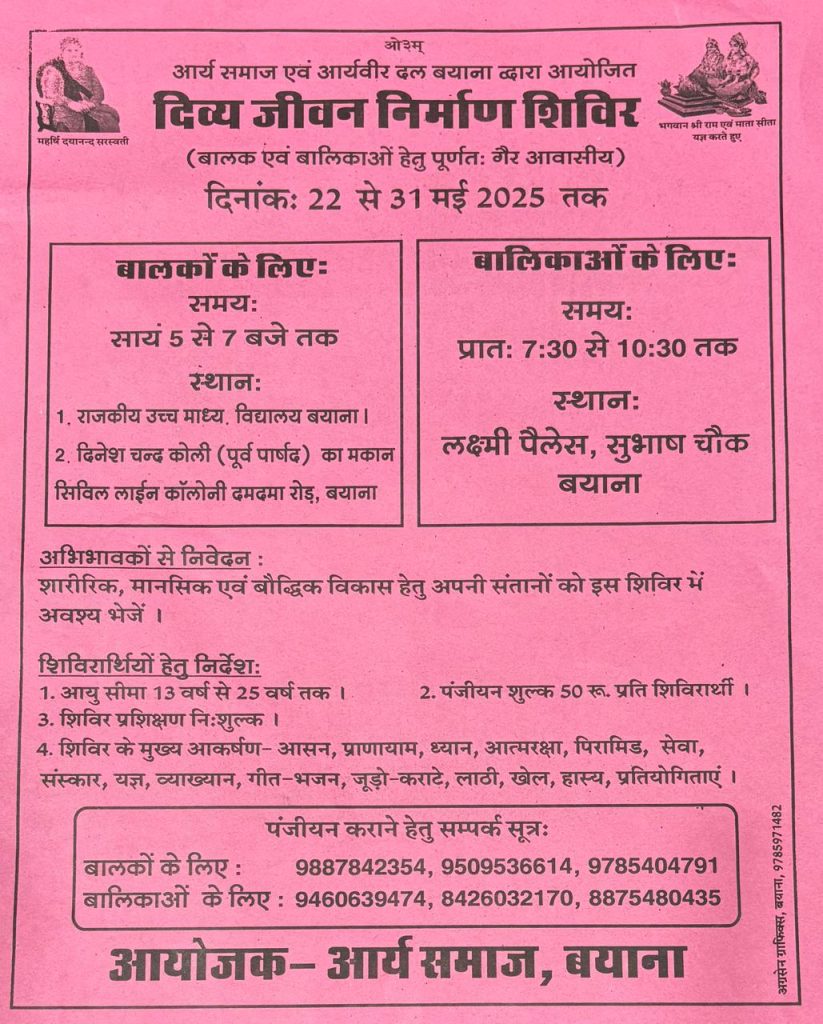 आर्य समाज एवं आर्य वीर दल, बयाना के संयुक्त तत्वावधान में “दिव्य जीवन निर्माण शिविर” का आयोजन दिनांक 22 मई से 31 मई 2025 तक किया जा रहा है। यह शिविर बालक एवं बालिकाओं के शारीरिक, मानसिक एवं बौद्धिक विकास हेतु पूर्णतः गैर-आवासीय रूप में आयोजित होगा।
