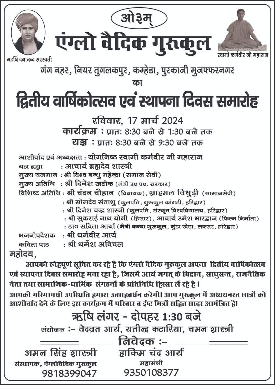 आपकी गरिमामयी उपस्थिति हमारा उत्साहवर्धन करेगी। आप गुरुकुल में अध्ययनरत छात्रों कोआशीर्वाद देने के लिए इस कार्यक्रम में परिवार व ईष्ट मित्रों सहित सादर आमंत्रित है।