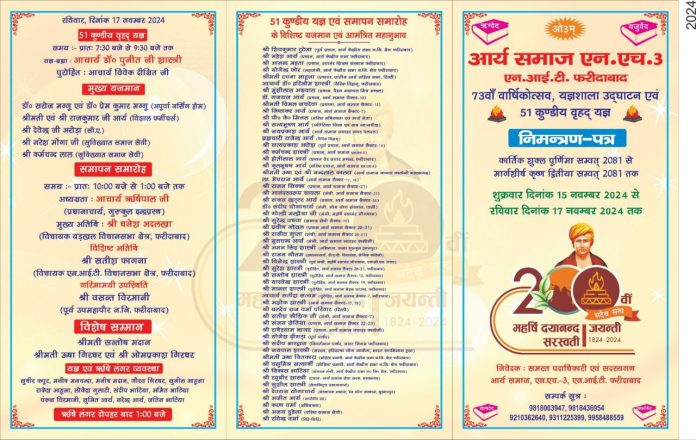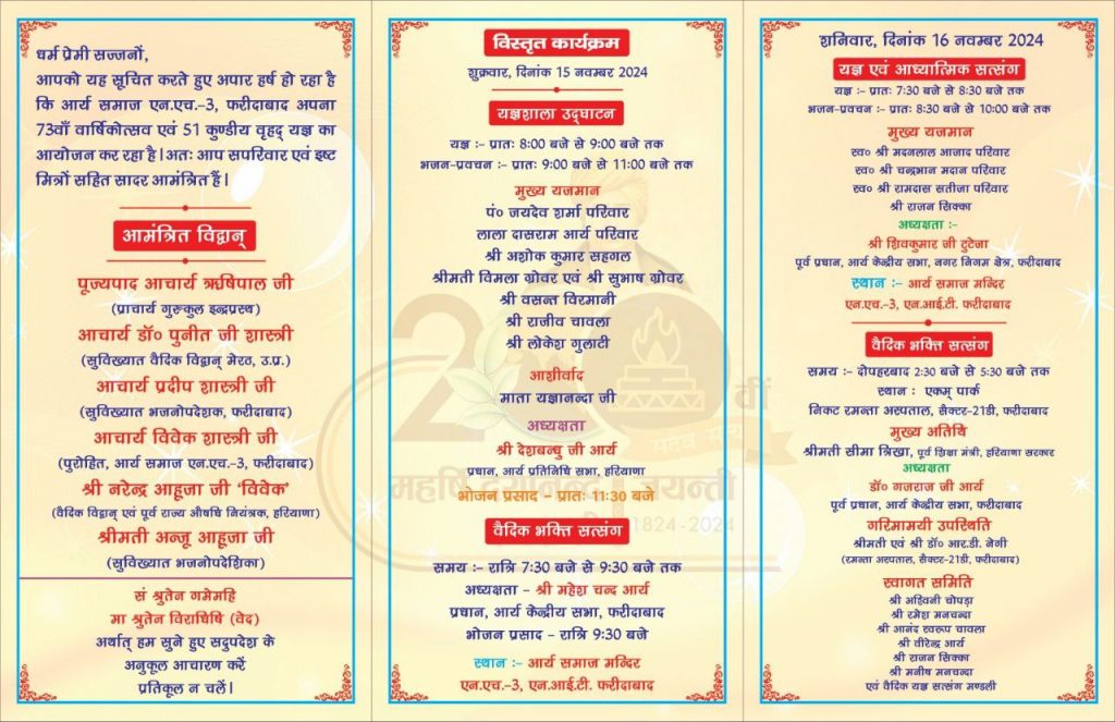 आपको यह सूचित करते हुए अपार हर्ष हो रहा है कि आर्य समाज एन.एच.-3, फरीदाबाद अपना 73वाँ वार्षिकोत्सव एवं 51 कुण्डीय वृहद् यज्ञ का आयोजन कर रहा है। अतः आप सपरिवार एवं इष्ट मित्रों सहित सादर आमंत्रित हैं।