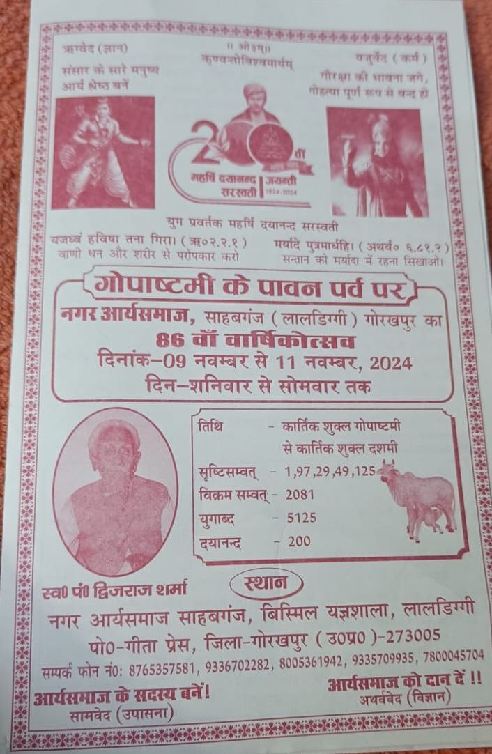 नगर आर्यसमाज, साहबगंज (लालडिग्गी) गोरखपुर का 86 वाँ वार्षिकोत्सव