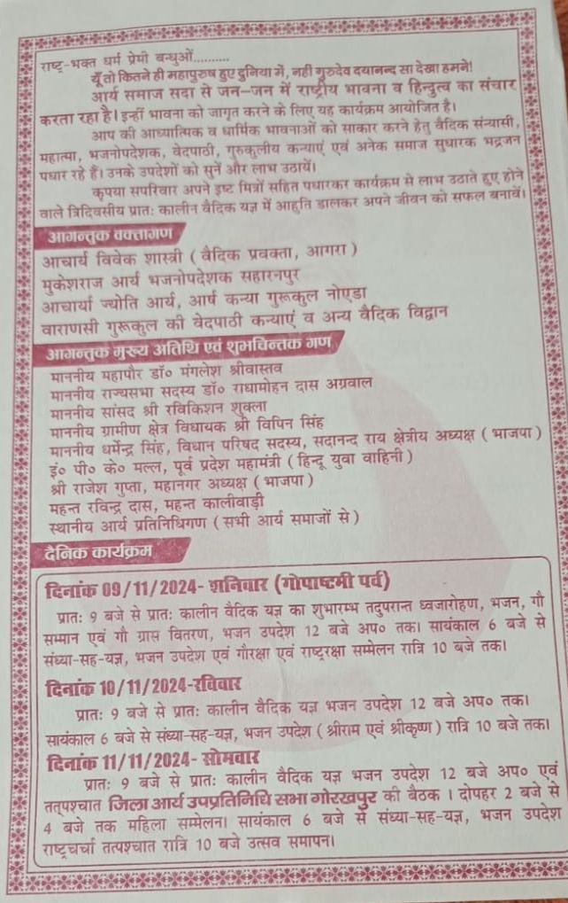 कृपया सपरिवार अपने इष्ट मित्रों सहित पधारकर कार्यक्रम से लाभ उठाते हुए होने वाले त्रिदिवसीय प्रातः कालीन वैदिक यज्ञ में आहुति डालकर अपने जीवन को सफल बनायें।